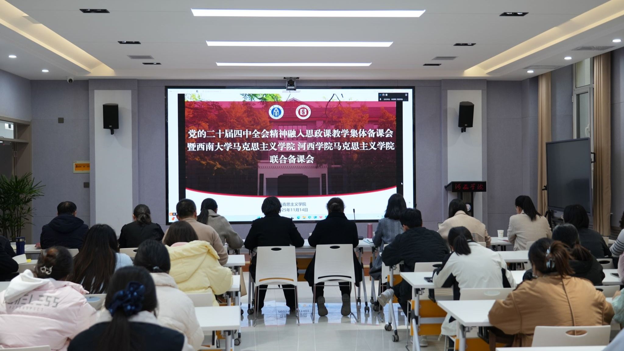 西南大学马克思主义学院党委书记吴文杰、河西学院马克思主义学院党委书记邬晓宁在会前分别致辞,希望以此次备课会为契机,加强两院之间交流合作,凝聚协同育人强大合力,在马克思主义理论学科建设、思政课教学改革创新、理论研究阐释等多个层面,开展更加丰富多元的交流合作;在集体备课环节中,西南大学马克思主义学院习近平新时代中国特色社会主义思想教育系主任史君教授、毛泽东思想和中国特色社会主义理论体系教育系主任雷鉴教授、马克思主义基本原理教育系钟志凌教授、思想政治教育系陈涛教授、中国近现代史教育系谢健教授、形势与政策课教研室何红连教授、研究生思想政治理论课教研部龙晓菲教授、河西学院马克思主义学院思想政治教育专业教研室主任张芬昀教授、习近平新时代中国特色社会主义思想概论教研室主任张鸣春副教授,9位老师围绕不同课程模块,就如何将党的二十届四中全会精神融入教学实践,加强教学效果进行了分享;在自由讨论环节,双方教师就教学难点与创新路径进行了深入研讨。
