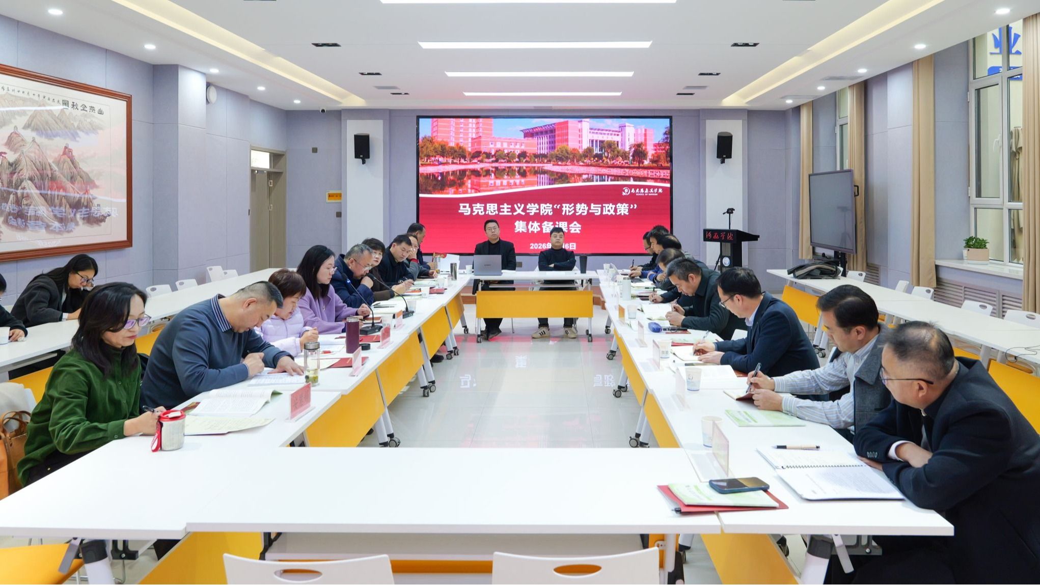 为深入学习贯彻习近平总书记关于思政课建设的重要指示精神,全面落实党中央关于新时代思政课程改革的部署要求,切实提升“形势与政策”课教学质量,3月6日,马克思主义学院召开2026年春季学期《形势与政策》集体备课会。教务处负责人,校级督导组成员,马克思主义学院班子成员及全体“形势与政策”任课教师参加。