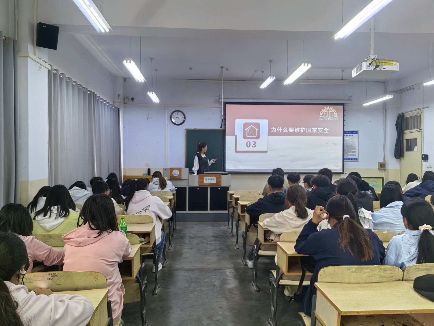 宣讲会上,校宣讲团成员围绕总体国家安全观的核心要义、理论内涵与时代要求展开系统讲解。宣讲立足新时代国家安全实践,从政治安全、文化安全、网络安全、意识形态安全等关键领域入手,结合国内外形势变化与典型安全案例,深入阐释国家安全在党和国家工作大局中的重要地位,解读总体国家安全观“十个坚持”的精神实质,引导师生深刻认识国家安全与个人成长、社会发展、民族复兴的紧密联系。宣讲号召同学们要自觉树立国家安全观念,增强辨别是非能力,坚决抵制各类错误思潮与有害信息,争做国家安全的坚定守护者、积极宣传者和模范践行者。